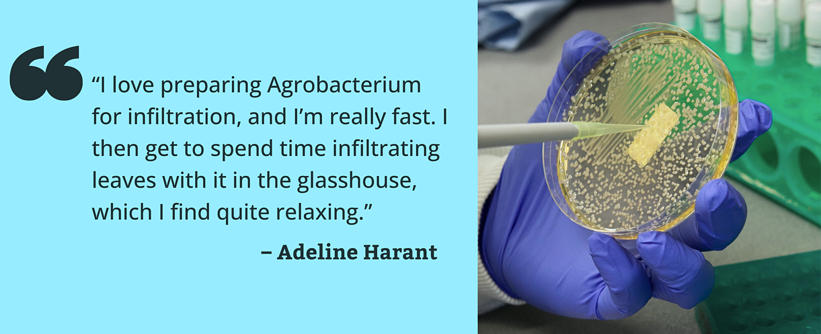 I love preparing Agrobacterium for infiltration. I really like preparing it, and I’m really fast at doing it. I then get to spend time infiltrating leaves with it in the glasshouse, which I find quite relaxing.