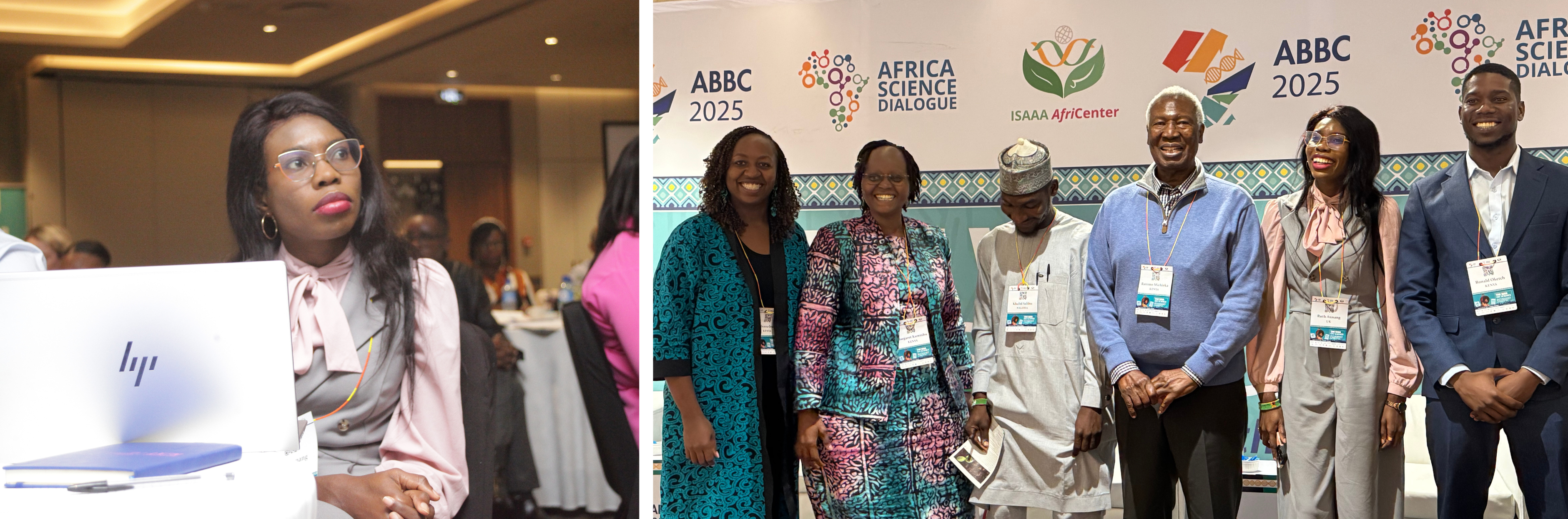 From left to right: Bibiana Iraki (Senior Programs Officer, ISAAA Africenter), Margaret Karembu (Director, ISAAA Africenter and ABBC Convenor), Khalid Umar Salihu (Farmer, Nigeria), Prof. Ratemo Michieka (Chair, Kenya National Academy of Sciences), Ruth Annang (MSc student at The Sainsbury Laboratory), Ronald Oketch (AI developer, AgriGuard).