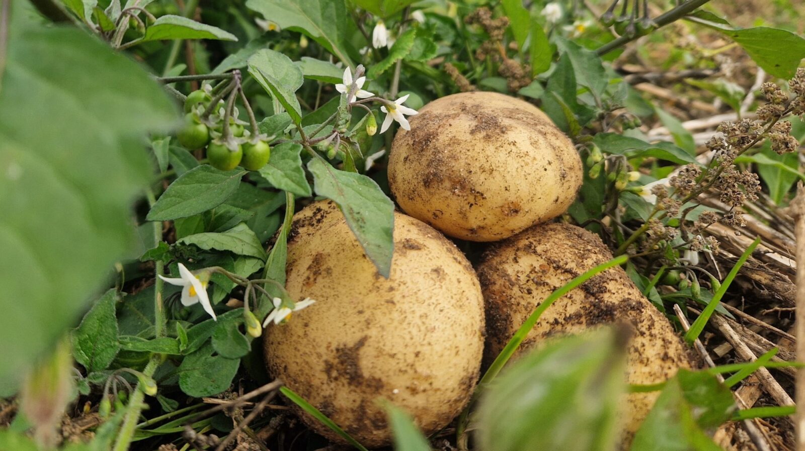 Freshly dug up PotatoPlus tubers from our field trial next to their wild relative and neighbour, Solanum nigrum (pictured).
